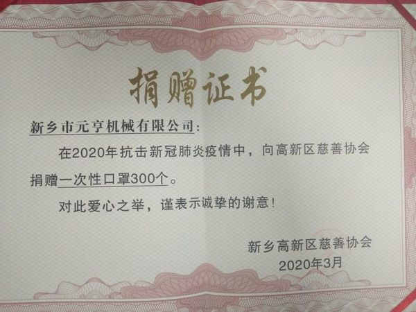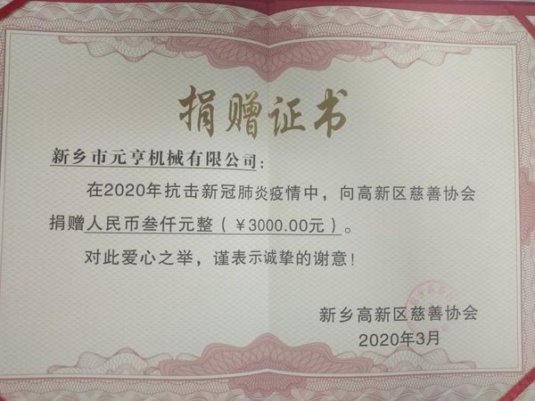 新鄉(xiāng)市元亨機(jī)械有限公司,自2004年建廠十多年以來(lái),積極投身社會(huì)公益事業(yè)中來(lái),這次疫情到來(lái)之際,我們**時(shí)間向當(dāng)?shù)丶t十字會(huì)捐款捐物,為疫情的控制盡我們企業(yè)自己的一份力。