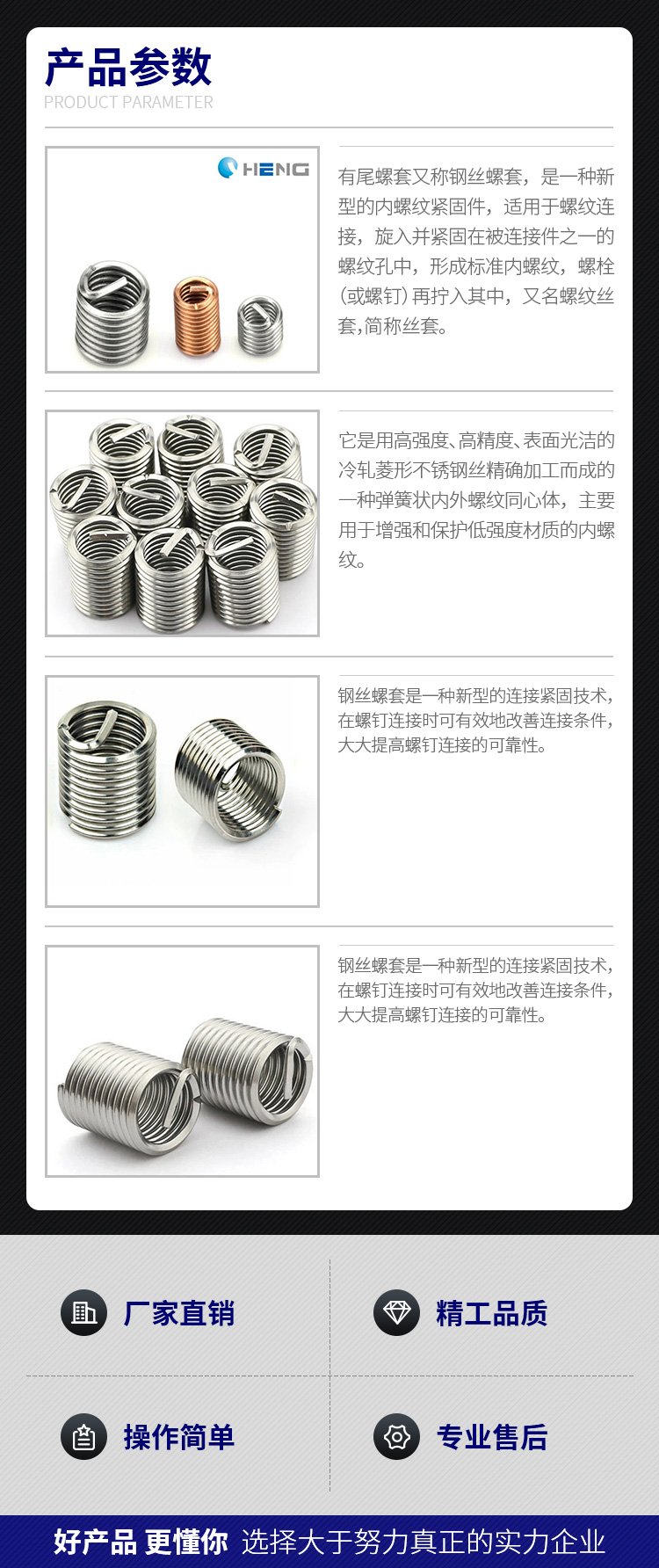 簡易螺紋護套安裝工具有螺紋頭、光桿兩種。用于少量安裝,一般維修、實驗時用,操作時不易安裝,鋼絲螺套容易報廢。