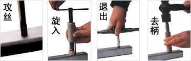 鋼絲螺套在安裝過程中出現(xiàn)問題需要取出,應(yīng)當使用專用鋼絲螺套取出工具---卸套器,將卸套器放入鋼絲螺套孔內(nèi),對準手柄用榔頭猛擊一下,用手加力按下手柄反螺紋旋轉(zhuǎn)即可取出鋼絲螺套。