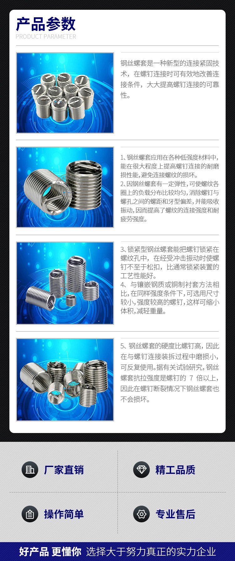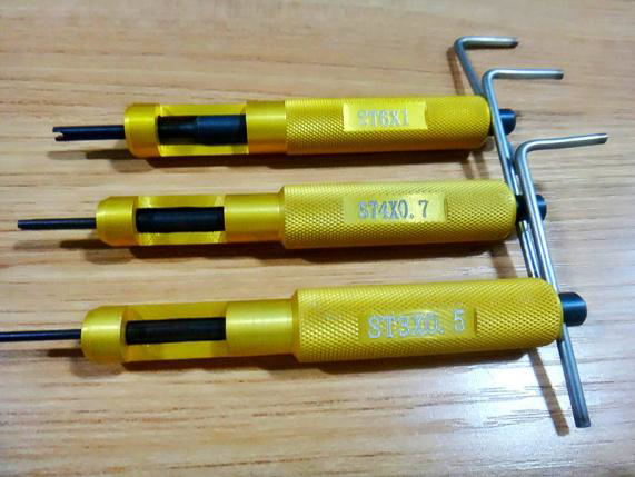 簡易螺紋護套安裝工具有螺紋頭、光桿兩種。用于少量安裝,一般維修、實驗時用,操作時不易安裝,鋼絲螺套容易報廢。