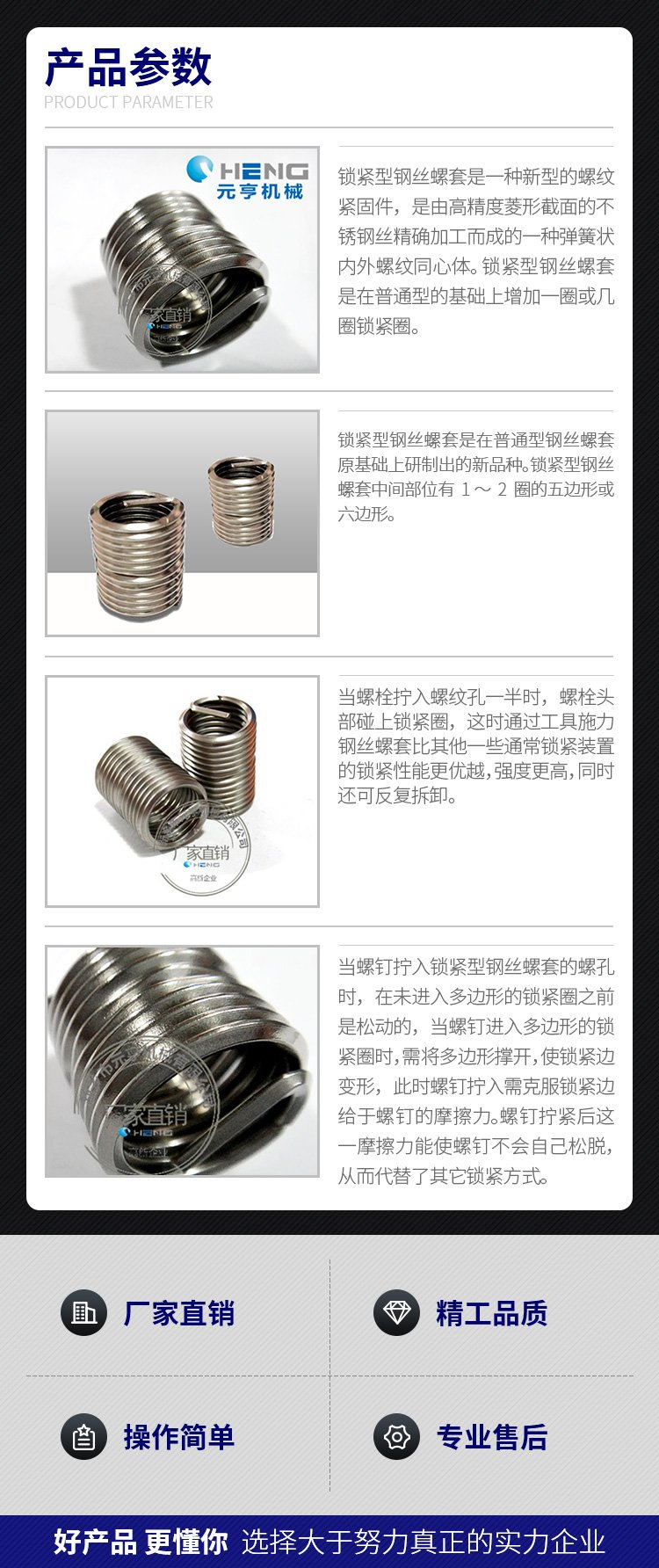 簡易螺紋護套安裝工具有螺紋頭、光桿兩種。用于少量安裝,一般維修、實驗時用,操作時不易安裝,鋼絲螺套容易報廢。