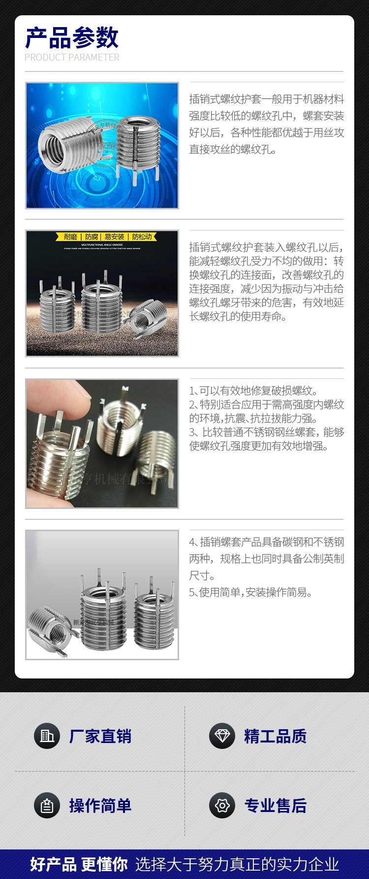 簡易螺紋護套安裝工具有螺紋頭、光桿兩種。用于少量安裝,一般維修、實驗時用,操作時不易安裝,鋼絲螺套容易報廢。